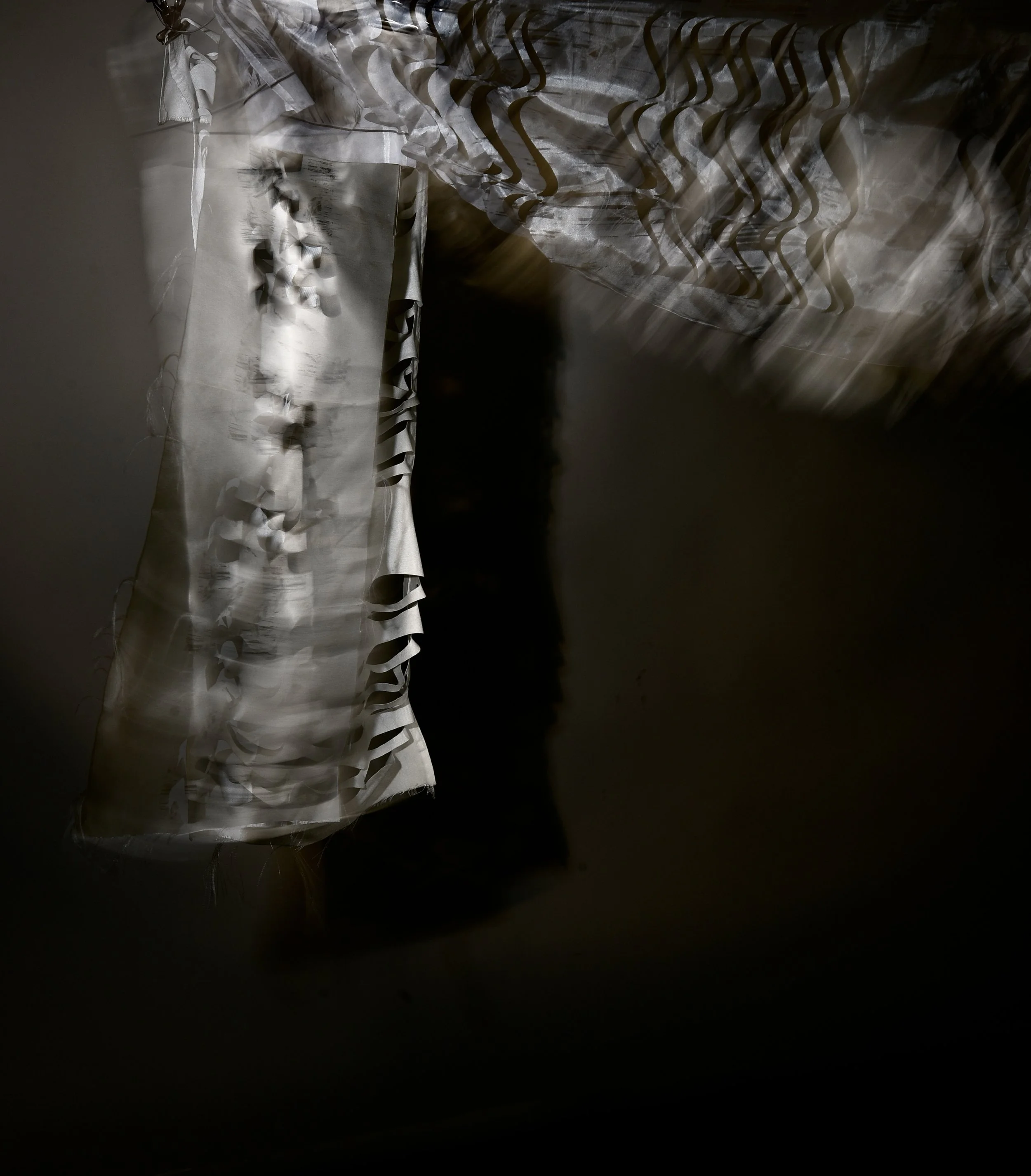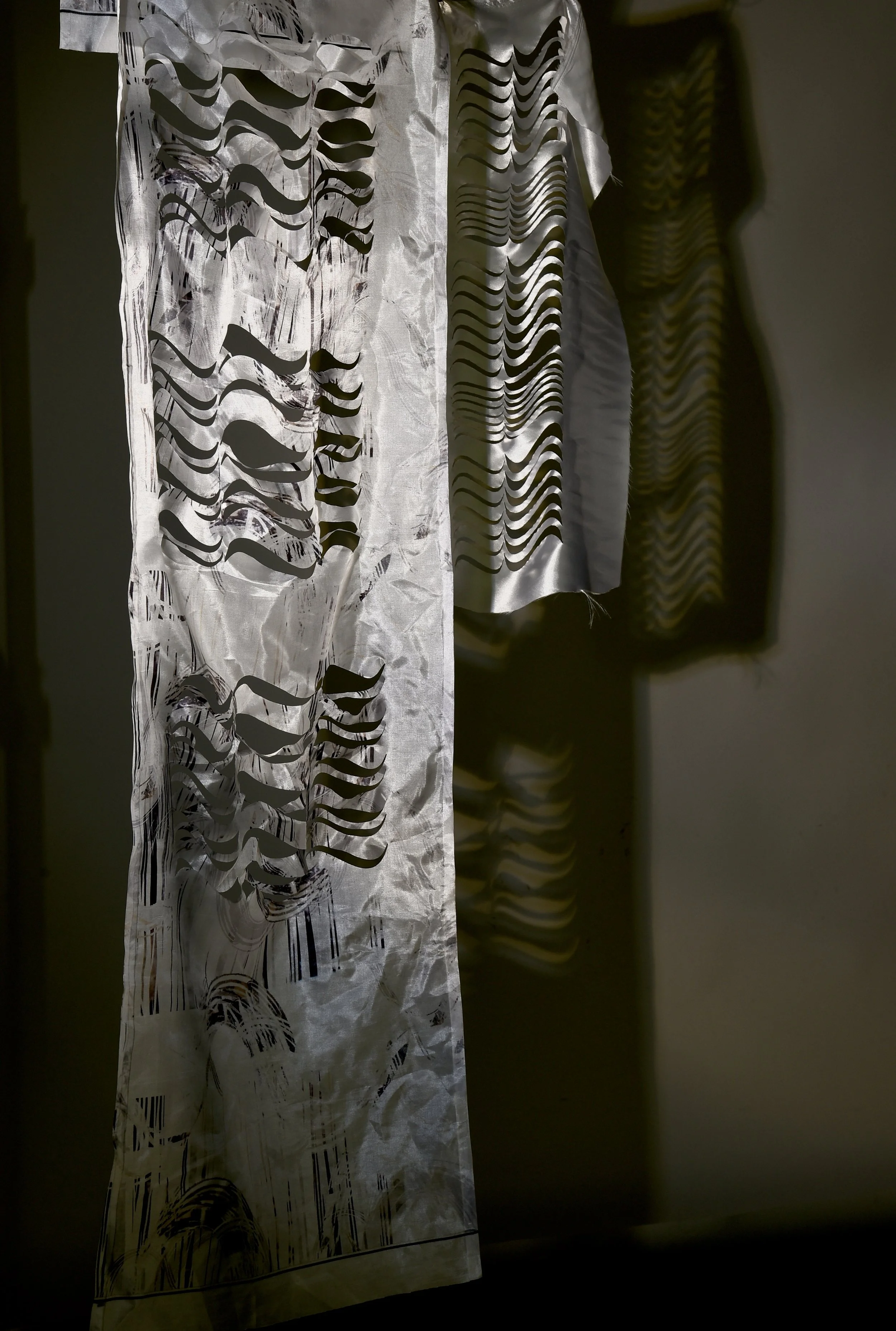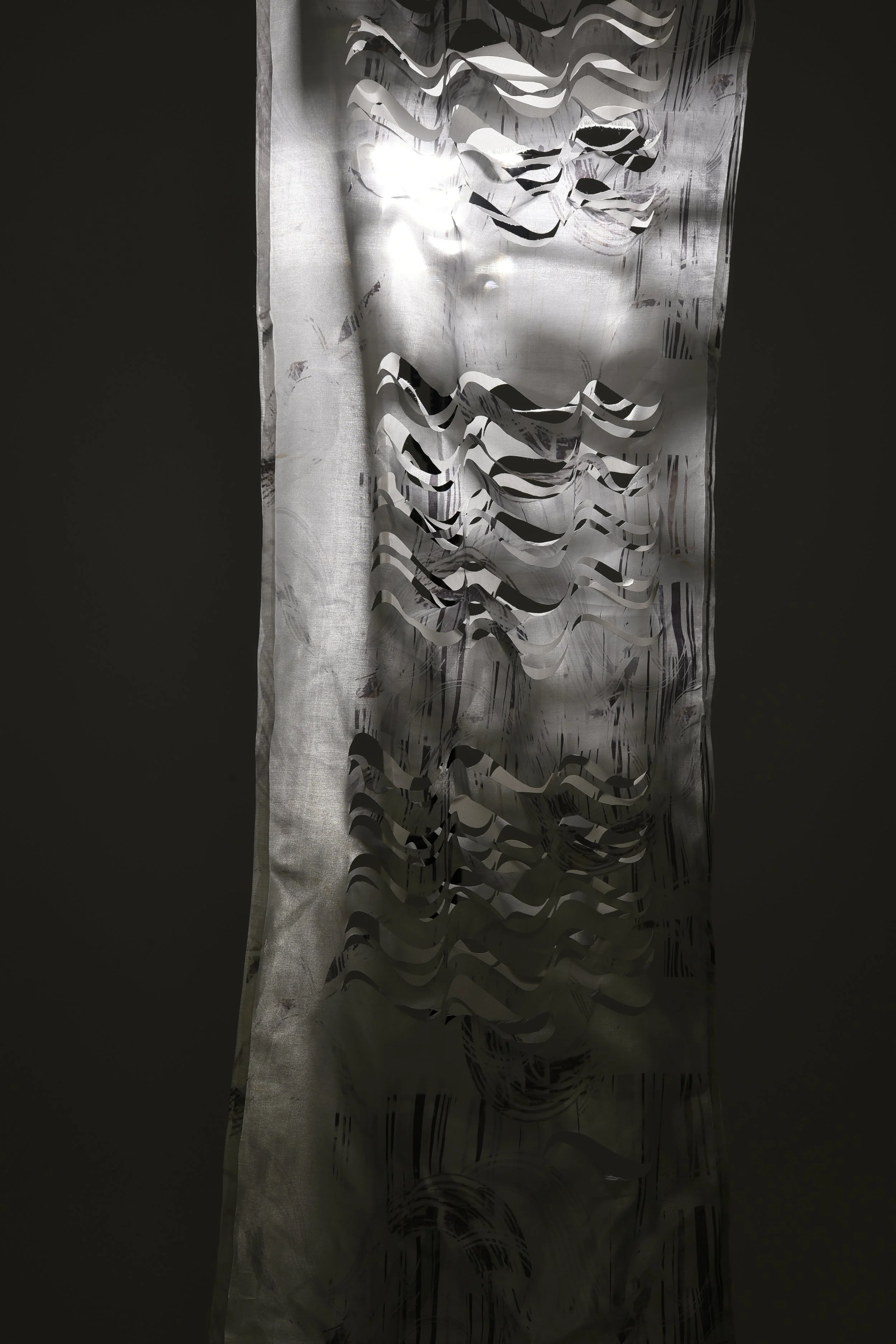 Fabric has been examined in terms of its intrarelation between process, surface and the environment. The transformative potential of working with the concepts of light, movement and pattern has informed experimental processes of making in my textile practice. The changeability of the textile is explored through light and shadow.